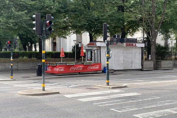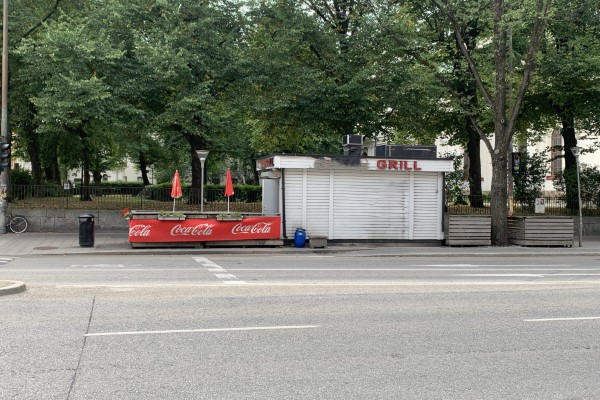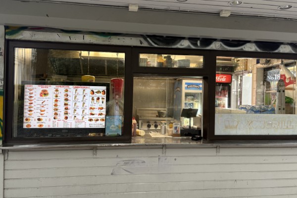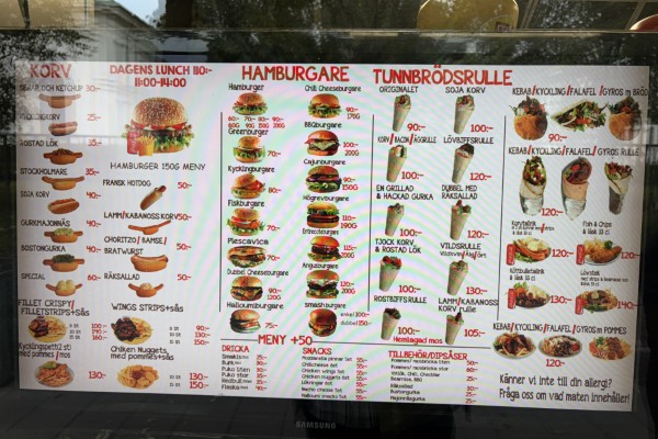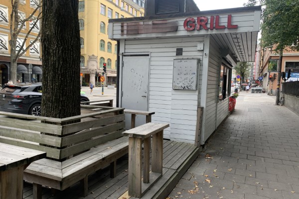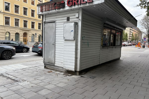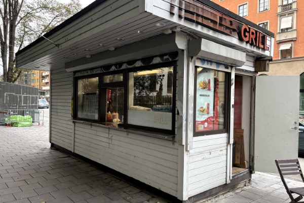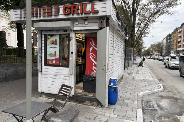 På en av Stockholms stora huvudgator finner ni detta klassiska gatukök med försäljning genom lucka.