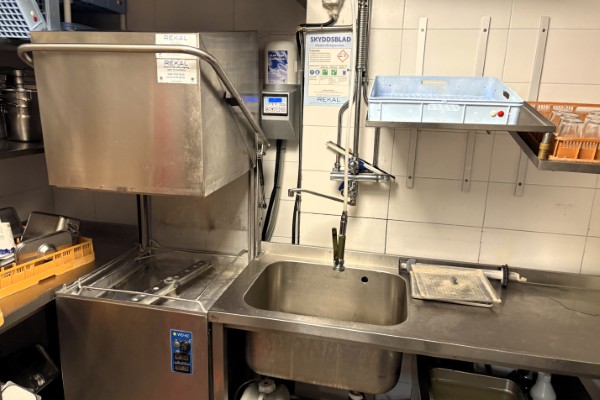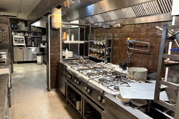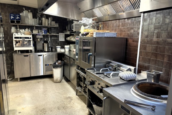 Köket finner man längst in i lokalen. Det välutrustade köket har stadsgas, starkventilation och fettavskiljare. Bra maskinell utrustning, som till exempel gasspis med 8 brännare, dubbelfritös, rationalugn, tandoriugn separat diskrum och degrum samt förvaringsutrymmen.