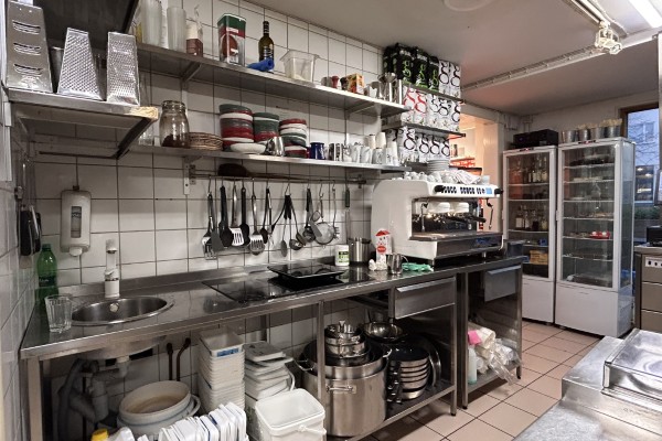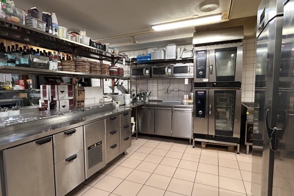 I köket finner man bra tilltagna arbetsbänkar, 2 Rationalugnar med kåpa i nyskick, espressomaskin, spis, fritös och all annan tänkbar utrustning som kan behövas för att bedriva en bra lunch- och kvällsverksamhet.