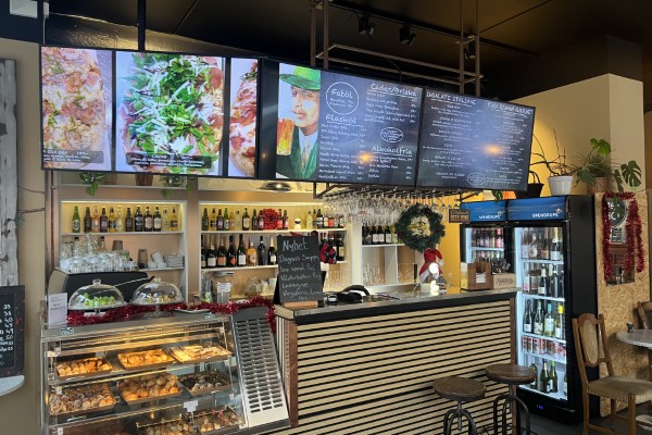 Menyn erbjuder flertalet olika sallader och populära Pinsa (Pizza). Caféet har för närvarande öppet måndag - fredag 10–21. Tiderna går naturligtvis att utöka och anpassa efter eget koncept.