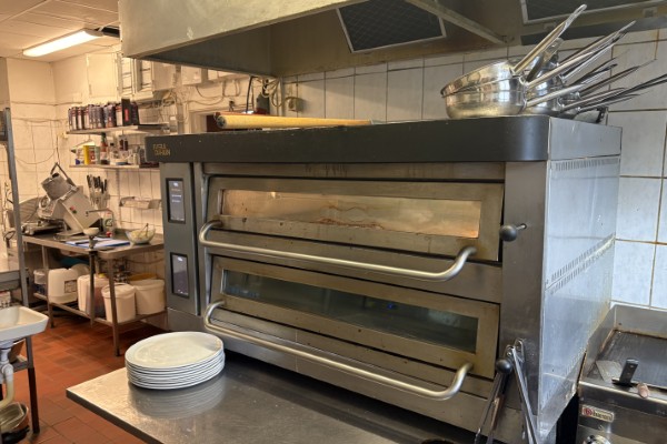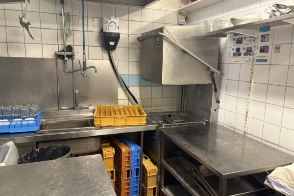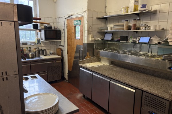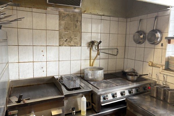 Köket är välutrustad för verksamheten och har bland annat pizzaugn, stekbord, fritös och spis. Diskrum och kylrum finns. Även köket har en källare och här finns omklädningsrum, förråd och degrum.